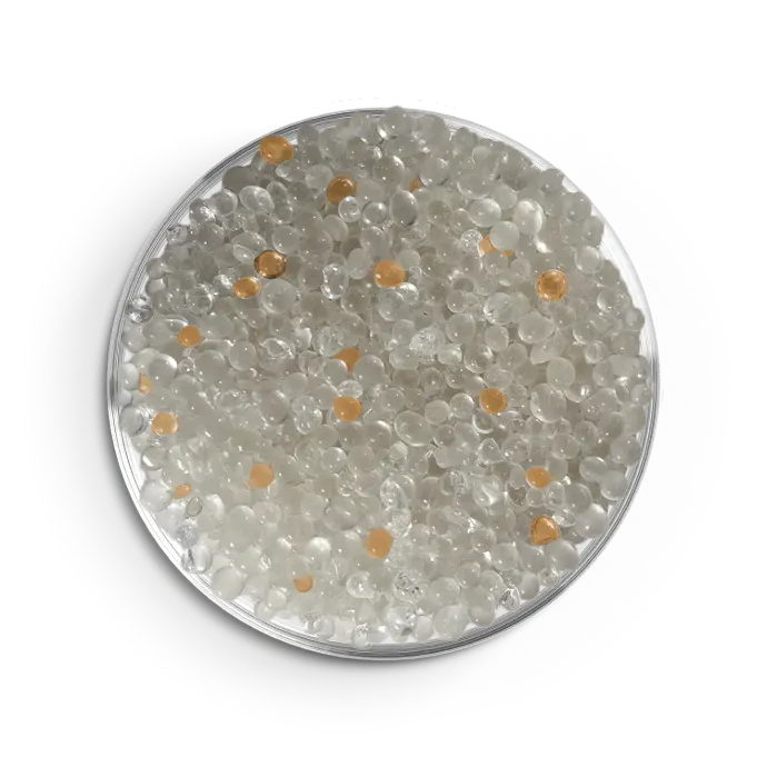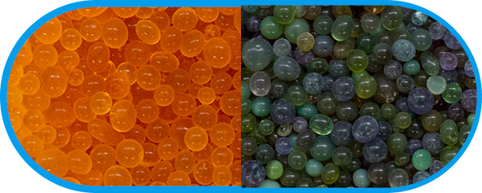 Unser PORESPHERE™ A-Flower Drymix enthält 20% orangenes Silicagel, das mit einem Farbindikator ausgestattet ist. Je mehr Feuchtigkeit von den Trockenperlen aufgenommen wird, umso mehr verfärbt sich das Granulat von orange zu grün und zeigt damit an, dass es kein weiteres Wasser mehr aufnehmen kann.