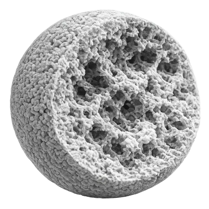 Das fertige Silicagel ist ein hartes Kügelchen, dass im Kern aus einem Schwammnetzwerk aus winzigen Poren und Kanälen besteht. Diese Struktur ist amorph, d.h. die Poren sind unregelmäßig verteilt und verschieden groß.