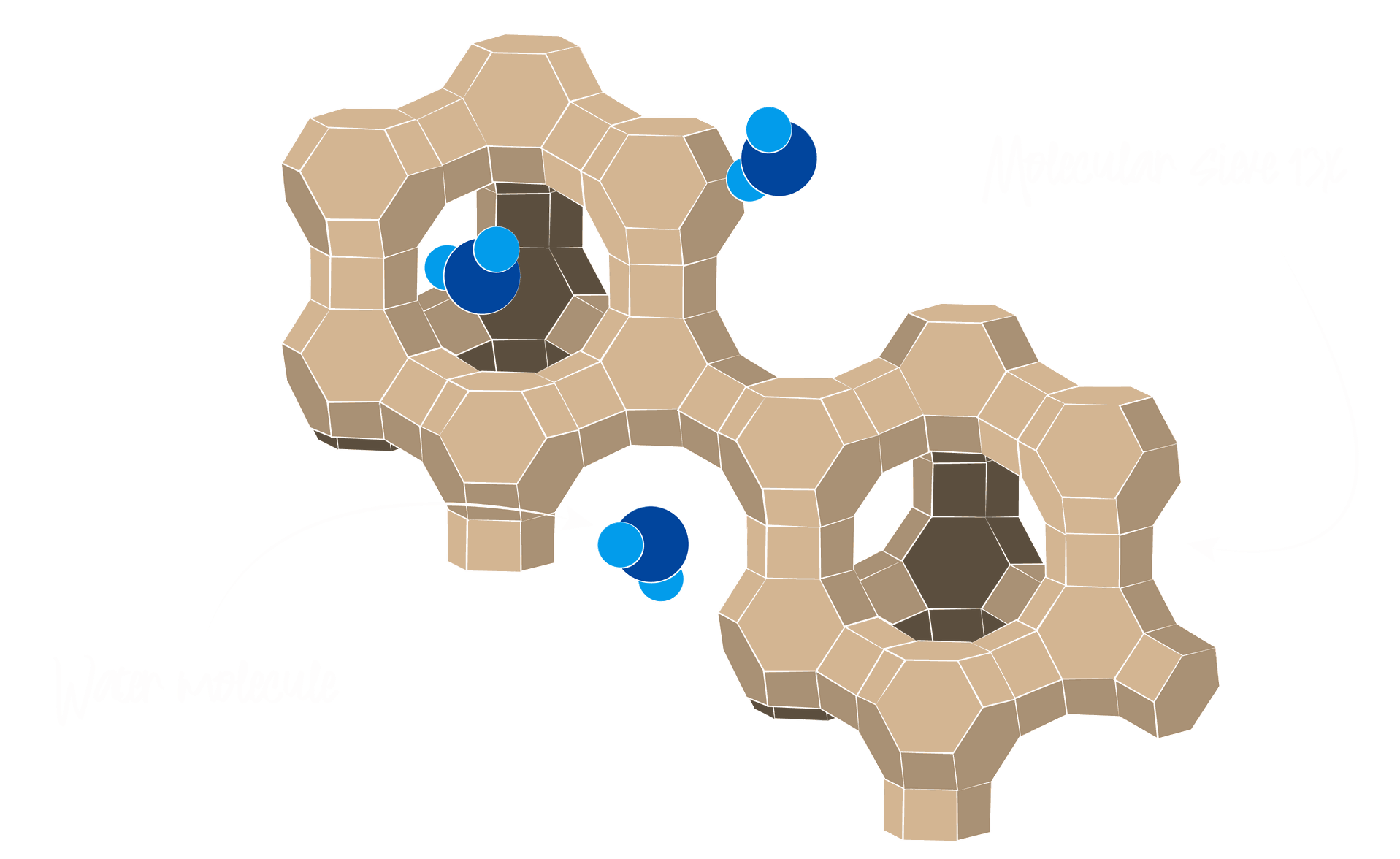 Molekularsiebe nehmen Stoffe durch das Prinzip der Adsorption auf. Dank der unzählige Poren und Hohlräume in den Käfigen bildet sich eine enorm große Oberfläche von bis zu 1250m² pro Gramm Material, an der sich Moleküle anlagern können.